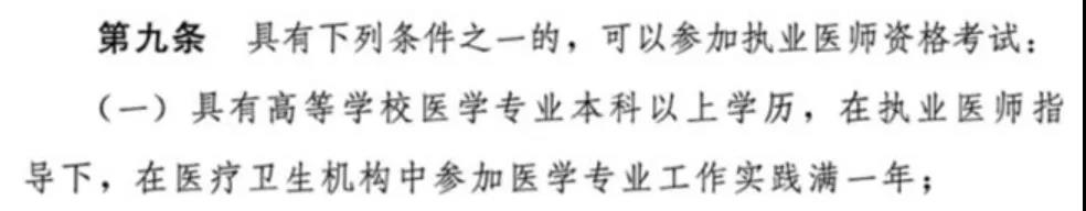 ①具有高等学校医学专业本科以上学历,在执业医师指导下,在医疗卫生机构中参加医学专业工作实践满一年;