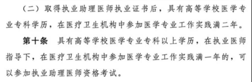 ②取得执业助理医师执业证书后,具有高等学校医学专业专科学历,在医疗卫生机构中参加医学专业工作实践满二年”,直接取消了中专学历的考试资格。