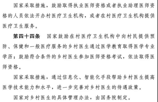 关于这一点,《草案》第四十四条规定:国家鼓励在村医疗卫生机构中向村民提供预防、保健和一般医疗服务的乡村医生通过医学教育取得医学专业学历;鼓励符合条件的乡村医生参加医师资格考试,依法取得医师资格。国家采取措施,通过信息化、智能化手段帮助乡村医生提高医学技术能力和水平,进一步完善对乡村医生的待遇政策。国家对乡村医生的具体管理办法,由国务院制定。